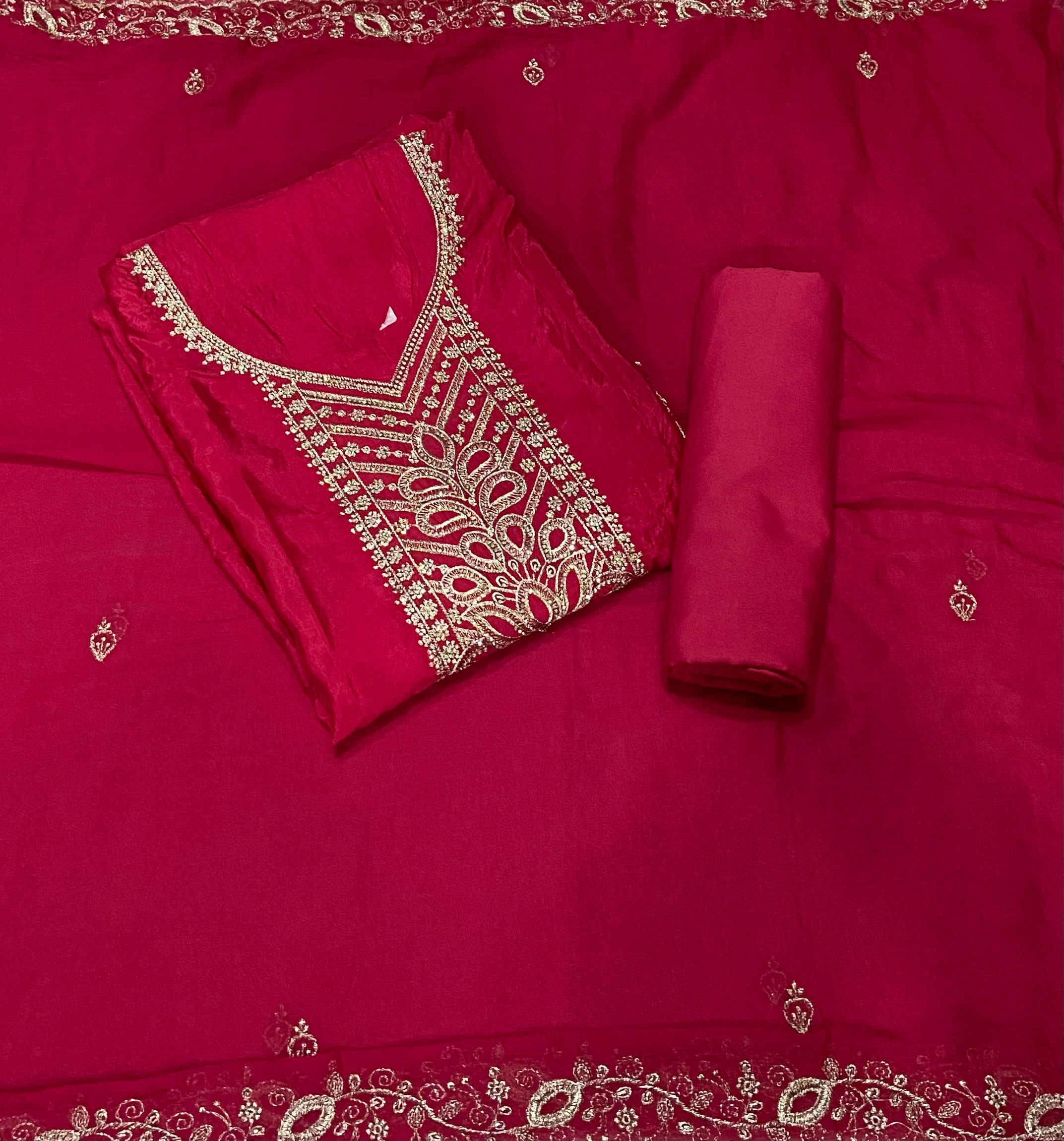 Classy Glass Organza Suit Set with Stone & Zari Thread Work