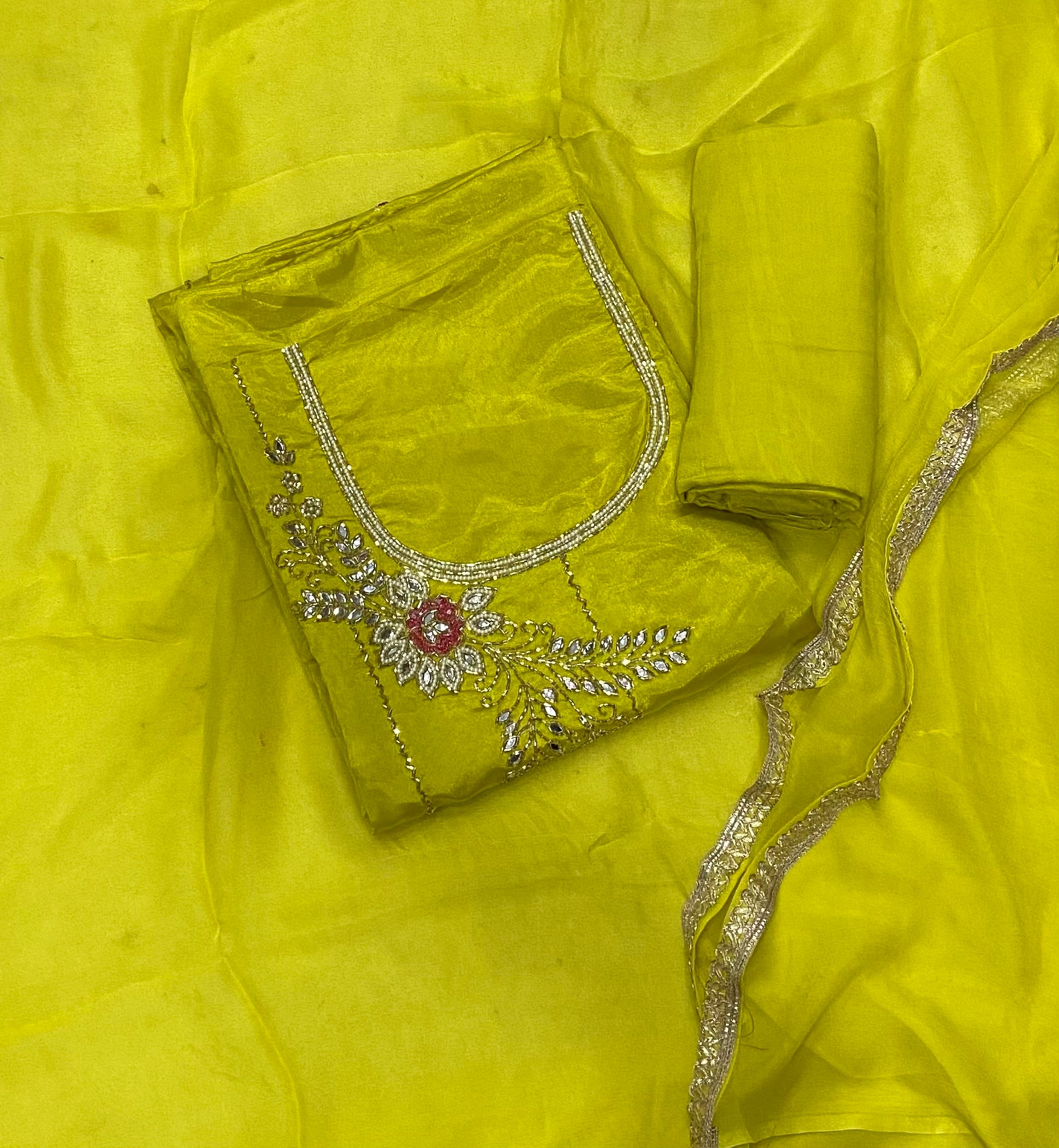 Glass Organza Suit Set with Heavy Real Mirror & Pearl Work