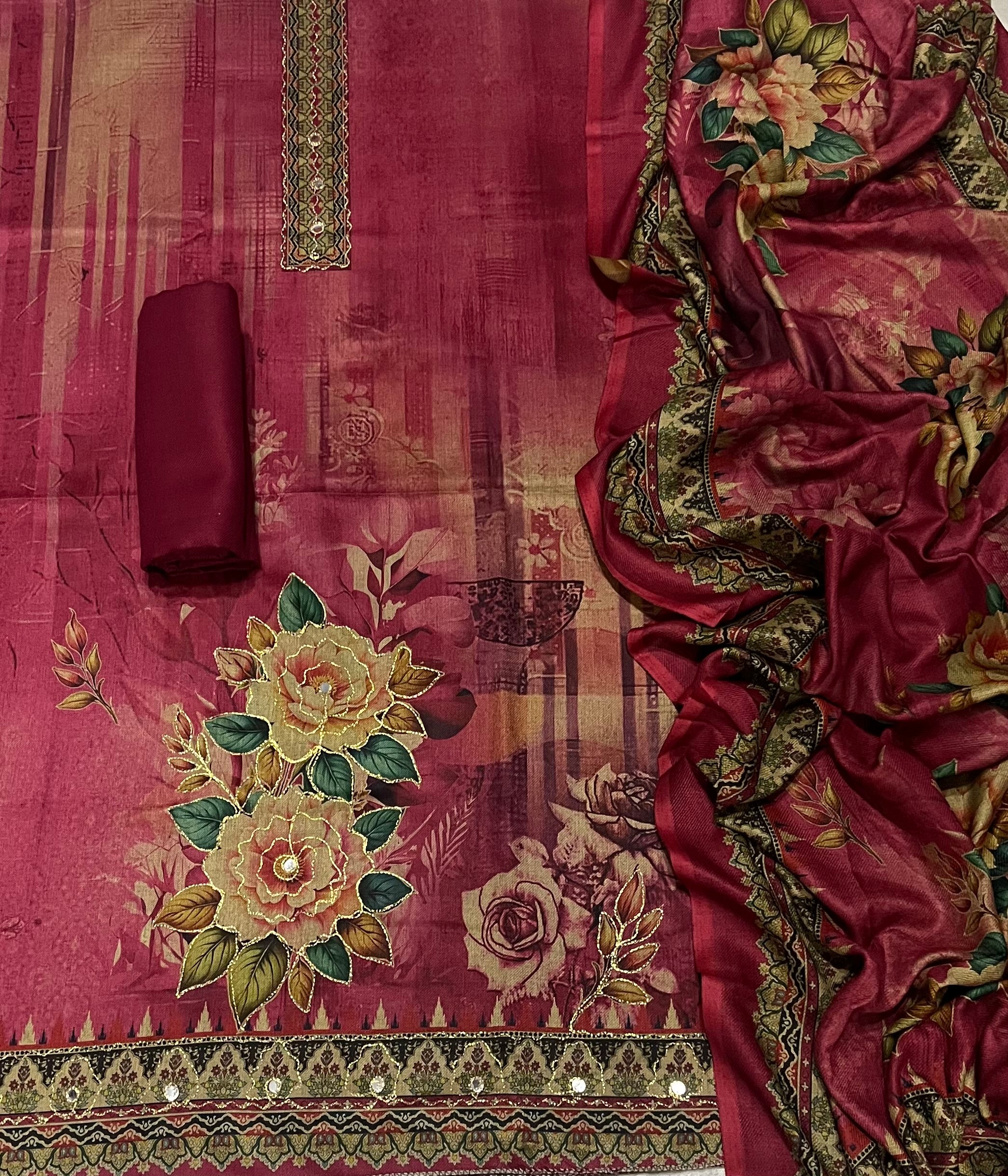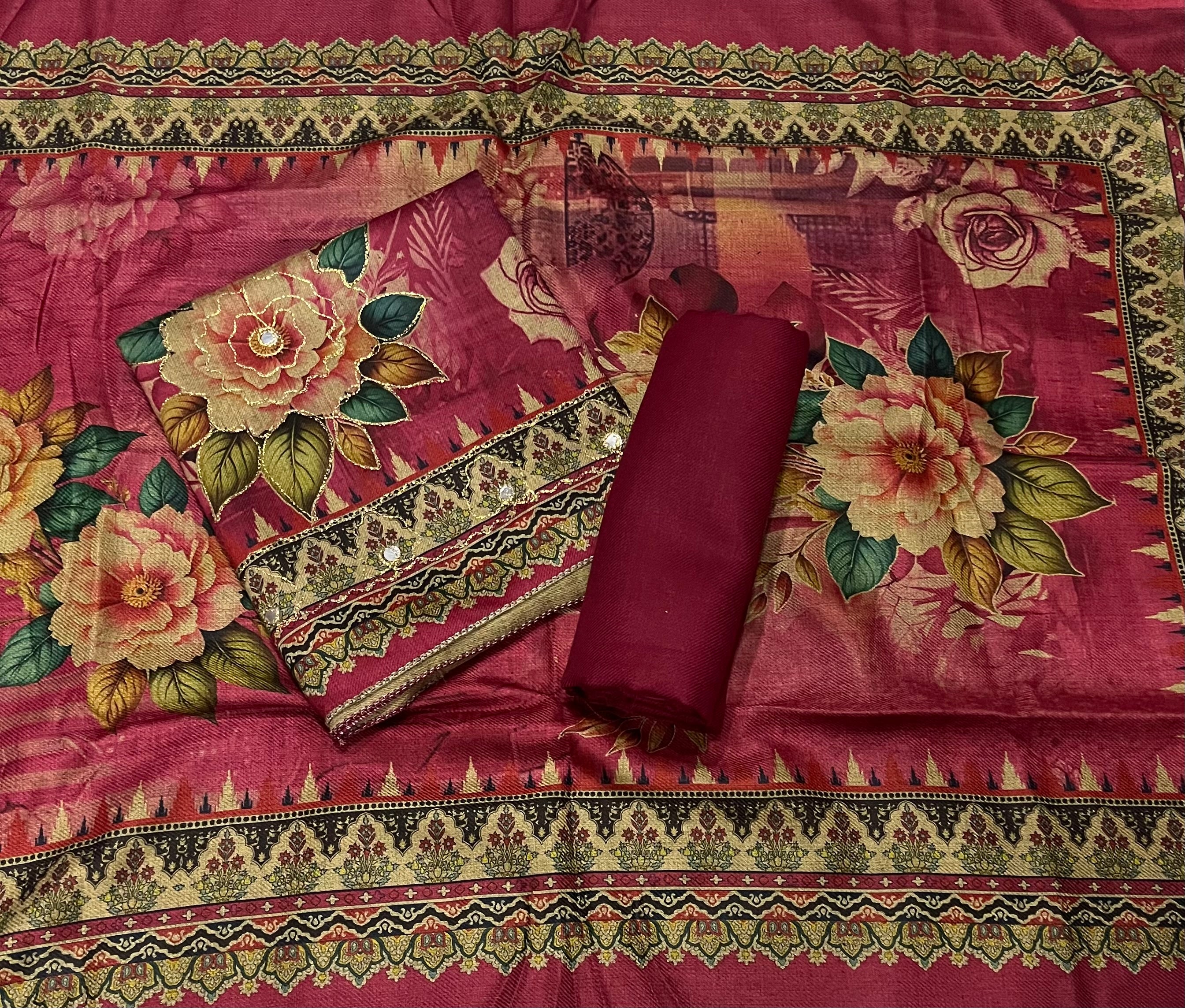 Stay warm and stylish this winter with our exclusive Winter Collection, offering a complete set of premium quality printed top, solid bottom & printed shawl perfect for the season. Crafted with care, these fabrics provide not just warmth but elegance, ensuring you look your best in every outfit.